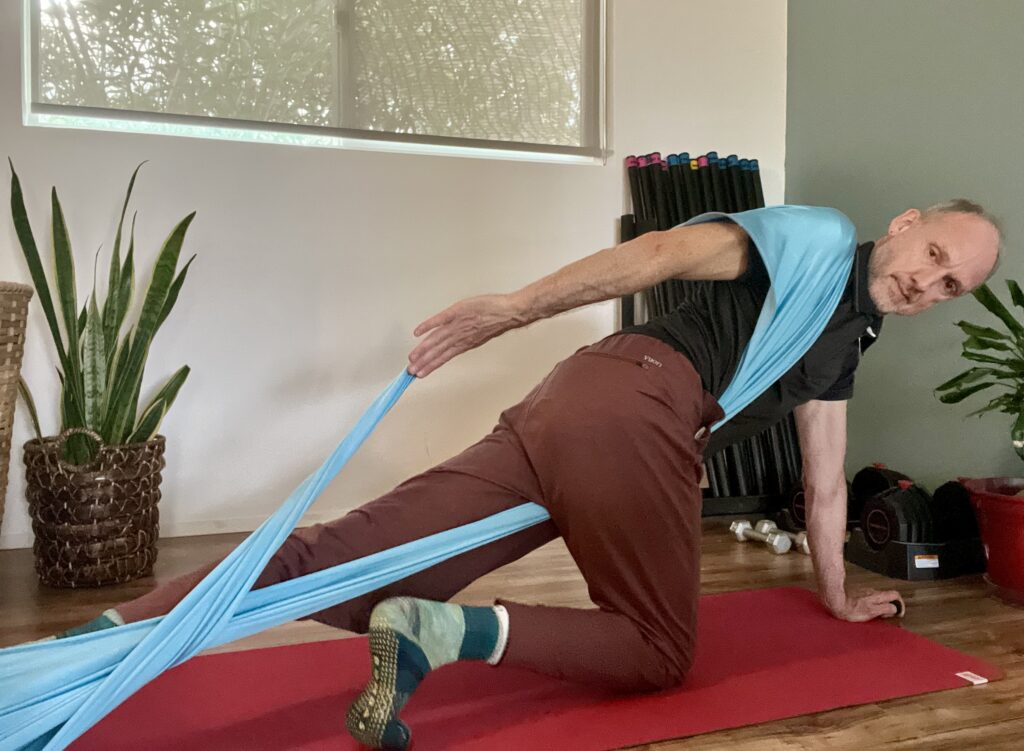 Slow down. The brain learns in the pause. Try an unusual angle. Let the band catch you somewhere surprising. Follow the sensation rather than the shape. These are not deviations from good movement practice. They are the practice.